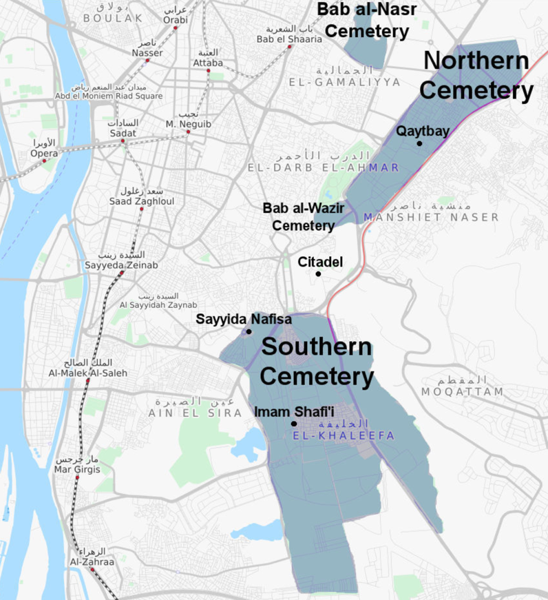 القرافة او مدينة الموتى أو صحراء المماليك هي مجموعة من المقابر الإسلامية (المدافن) منها ما هو تاريخي ومنها ما هو حديث. تمتد هذه المقابر بطول أربعة أميال وتنقسم إلى منطقتي المقبرة الشمالية والمقبرة الجنوبية. تقع المقبرة الشمالية شمال القلعة وتعرف أيضا باسم المقبرة الشرقية أوقرافة الشرق لأنها تقع شرق سور القاهرة الشرقي القديم أما المقبرة الجنوبية تقع جنوب القلعة كما توجد منطقة مقابر أصغر في الشمال تسمى باب النصر.